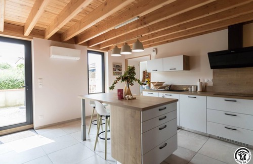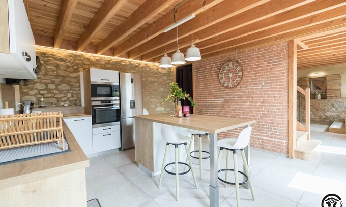 Sorèze pine for the parquet flooring in the bedrooms, exposed stone and beams on the ground floor. It is in the old miller's house of the 4 Montbel mills, now gone, that Marie-Célie, the owner, undertook 4 long years of work before opening this gîte. With a certain passion for the local terroir, she offers you a comfortable stay, with your family, in a quiet residential area. Advantage of the proximity of the village, here, everything is accessible on foot: shops, restaurants, lake, etc. The Gîte Les Echaunes owes its name to the old district where Marie-Célie's parents lived, a family originally from the Drôme. The composition of the photos will make you want to discover this wonderful region of Lauragais: Toulouse, 30km away, its Place du Capitole; the gastronomy of the southwest; Caraman, its swimming lake and its market. The names of the rooms have also been carefully chosen: "Violettes de Toulouse", "Cocagne", Souleilla" and "Canal du Midi" (exceptional creation by Pierre-Paul Riquet, uniting the Atlantic with the Mediterranean), which is 20km from the cottage. Revel-Lac-Saint-Ferréol is 23km away: Grand Site Occitanie, swimming lake and Cité d'Art; and Carcassonne is 78km away. Gîte on 2 levels with an unfenced garden of 300m2, large parking: - Ground floor: entrance - separate toilet - fitted kitchen - living/dining room. - First floor: - Bedroom "Souleilla" (1 double bed 160X200cm and 2 single beds 90X190cm, on the mezzanine after a steep staircase). - Bedroom "Canal du Midi" (1 double bed 140X190cm) with each with its own bathroom and private toilet. - "Violettes de Toulouse" room (2 single beds 90X190cm, including a pull-out bed to be installed on request). - "Cocagne" room (1 double bed 160X200cm). Bathroom, separate toilet shared by the 2 rooms. Reversible air conditioning in each room. Outdoor games: pétanque, molky and badminton. Please note: the facade is currently being renovated.