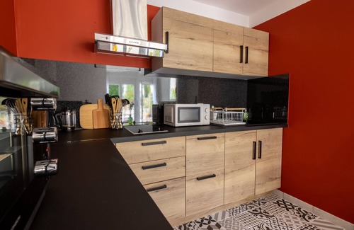 - A kitchen equipped with electric kettle, oven, microwave oven, toaster, cooking plates...