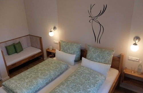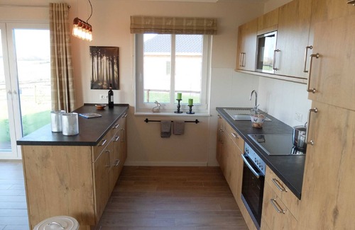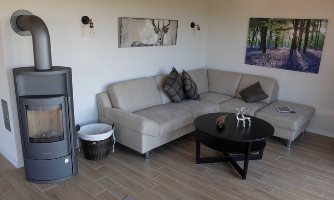 The 5-star Ferienhaus Jagdhaus is designed with stylish hunting motifs and offers up to 4 people plenty of space to relax. A spacious living / dining area with fireplace and open kitchen, 2 bedrooms (2x double bed, 2x single bed) and a full bath with free-standing bath and a guest toilet provide a pleasant holiday comfort. The beautiful landscape of the area can be enjoyed on the partly covered terrace. Here garden furniture for relaxing moments and a wide view over the fields and meadows. Of course, Wi-Fi is available free of charge and there are parking spaces in front of the house. In the cabin Jagdhaus a maximum of 2 dogs are welcome.