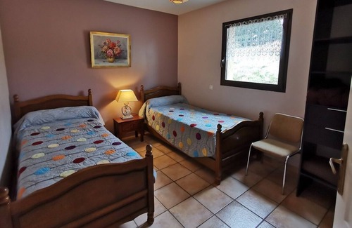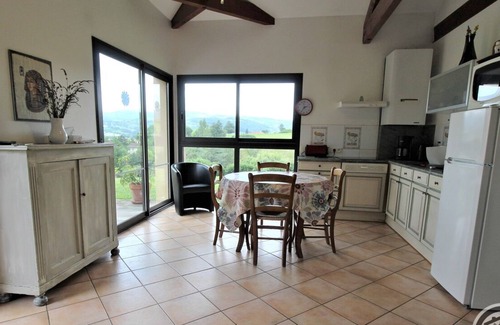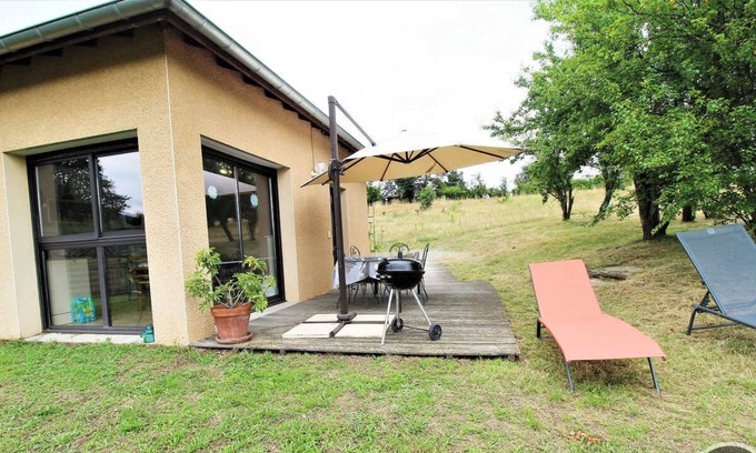 In peaceful countryside setting, West of Lyon, single storey detached house, on same property as owner's house. Perfect for business trips or holidays near city of Lyon (Pierre-Bénite exit off motorway nearby). Living room, kitchen /lounge areas. 2 bedrooms (160cm large bed or two 80cm beds) (2 single beds). Shower room/WC with access for the disabled. Underfloor heating. Terrace, garden furniture, unfenced meadow, barbecue, sunbeds, shared climbing frame. Close to Lyon Sud Hospital. On site : 2 guest rooms (one is a converted gipsy caravan) + 2nd self-catering gite + samll campsite, ideal for family gatherings. Many hiking, mountain biking trails nearby, very close to St Jacques de Compostelle path. Extra charge for pet : 2€/night/animal.