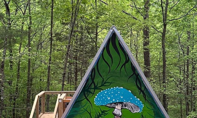 Your private deck has Adirondack chairs, water dispenser, coffee maker, and your own Solo Stove fire pit. Each A-frame serves as a canvas for a local visual artist.
