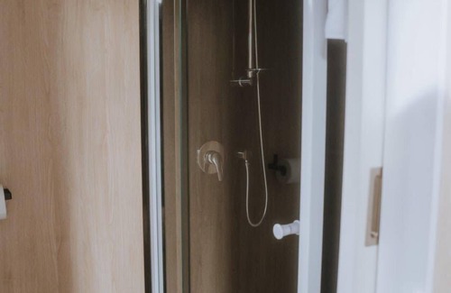 A cozy 139-square-foot tiny home with easy access to water, split air conditioning, a kitchenette, cooking equipment, and excellent bathroom facilities. These amenities include an eco-friendly cassette toilet with a removable waste holding tank, hand basin, and gas-heated shower.