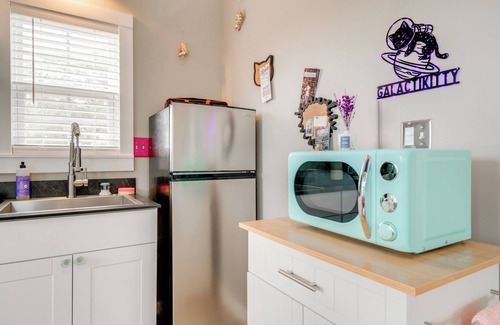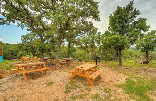 An out of this world getaway begins at this Brownwood vacation rental! With its colorful style and whimsical galaxy- and cat-themed decor, this 1-bedroom, 1-bath cabin promises a unique escape filled with fun. Ready to venture out? Spend time fishing, swimming, or shooting for the fairways at The Hideout Golf Club. Afterward, enjoy a delicious BBQ dinner in the shared picnic area. Your next Hill Country adventure awaits!