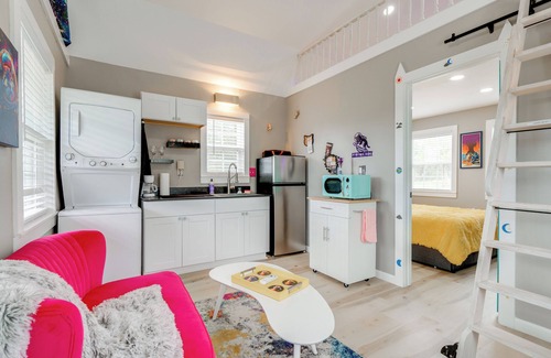 ADDITIONAL INFORMATION- This 2-story cabin requires exterior stairs to enter; the bedroom and full bathroom are located on the 1st floor- A ladder is required to access the loft on the 2nd floor- This property sleeps 2 guests in 1 bed, with room for 4 total guests by using the queen mattress in the loft- There is another bookable vacation rental on-site that shares the yard space; other travelers may be present during your stay- The porch swing has a maximum weight limit of 400 lbs- The loft has a maximum weight limit of 225 lbs- Your safety matters. This property features 1 exterior security camera located on the front door, facing the front outdoor entry. It does not look into any interior spaces. The camera records video and sound when activated by motion
