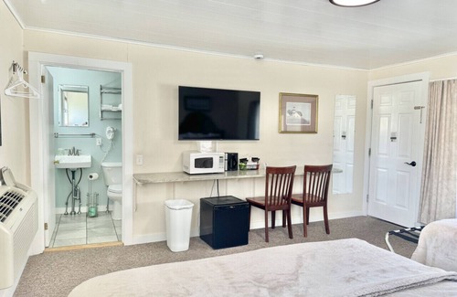 This comfortable double queen room features a full bathroom, dedicated parking, and amenities including a microwave, refrigerator, free wi-fi, and a Smart-TV. Also included is a large common greenspace with lawn chairs, propane grills, and a private dog-park. An ocean beach, several restaurants, a general store, and a specialty wine and cheese shop are within easy walking distance.