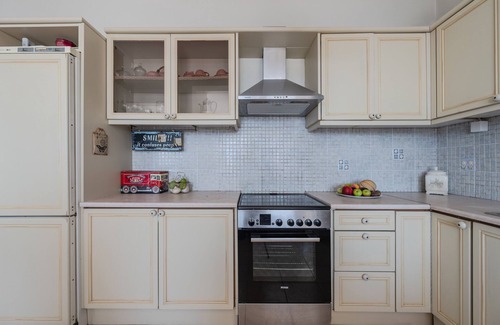 The ground-floor apartment features two inviting bedrooms—one with a cozy double bed and another with two single beds—comfortably accommodating up to four guests. A sleek, well-appointed bathroom with a shower provides all the essentials for a relaxing stay. The open-plan kitchen is fully equipped, giving you the freedom to prepare and enjoy meals.