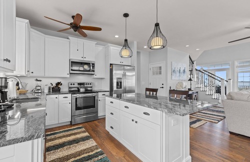 Gallops Point sleeps 6 - plus your well-trained furbaby - in comfort and style. The 1st floor Master is beyond beautiful and has a comfy King Bed. Slip out to the Waterfront Balcony to stargaze while everyone else slumbers. Even the Master Bath is special with Custom Cabinetry and a Walk-in Shower - and you’ll love the nautical touches throughout Gallops Point. Wandering upstairs, you’ll find 2 more Bedrooms which share a Jack and Jill Full Bath. Bedroom 2 also has a Queen Bed, Private Vanity, and Private Waterfront Balcony. Bedroom 3 is a Loft Bedroom and features 2 Full Beds. It overlooks the lovely Living Area, yet Barn Doors allow for privacy when needed.