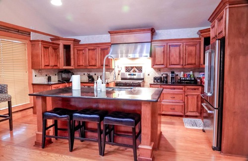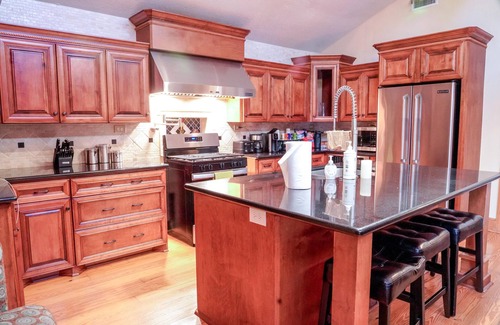 This rustic custom log home will pleasantly surprise you with nice big open floor plan, including a large gourmet kitchen with breakfast bar, over sized master suite with a spa like shower and soaking tub, pool side cabana game room with outside bar, Just blocks from boat launch that provides access to Galveston bay and first class fishing. 2 miles from Kemah boardwalk, Nasa Space Center and minutes away from fine dining and dive bars.