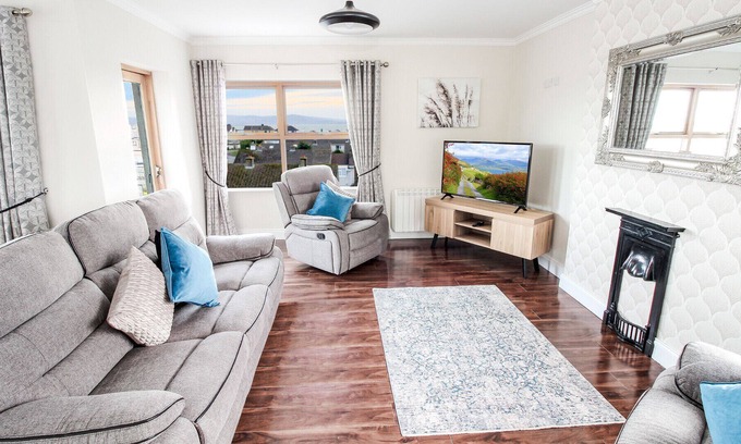 Attention to detail flows throughout the home and the wrap around windows make it a bright space throughout. Open plan living and dining, comfortable recliner sofas, and Smart TV for Netflix lovers offers a relaxing and cosy atmosphere. The home is located in a quiet building, ideal for families and quiet groups looking to explore the surrounding Galway sites. The kitchen is fully equipped with all major appliances and has a breakfast bar. There is also a washer and separate dryer.