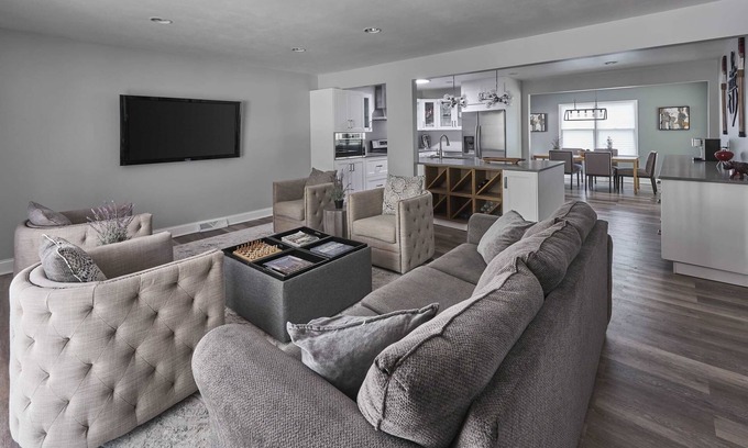 Step inside to an inviting open-concept living, kitchen, and dining area designed for gathering. The living room is anchored by a smart TV, a plush couch, and four comfortable armchairs—perfect for movie nights or game-day viewing. The modern kitchen boasts sleek stone countertops, stainless steel appliances, and a Keurig for your morning coffee, with the adjacent dining table offering seating for six. Sliding doors open to the back deck, where you’ll find cozy seating and a firepit to enjoy evenings under the Wisconsin sky.