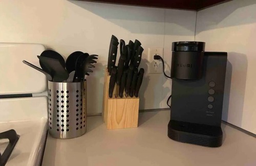 The kitchen is fully stocked with the essentials including an electric tea kettle, coffee marker, utensils, pots and pans, etc. The kitchen includes full size refrigerator, stove/oven, and microwave. There is NO dishwasher.