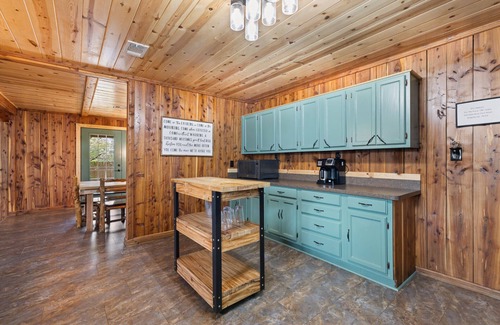 Gas Cook Stove - Refrigerator - Ice maker - Microwave - Dishwasher - Combination regular drip/ Keurig coffee maker - Blender - Mixer - Crock Pot - Toaster - Cookware - Silverware - Glassware - Utensils - Dishes - Baking pans - Bowls - Island with 2 bar stools - Table/Chairs - French doors leading to the hot tub on the back deck.