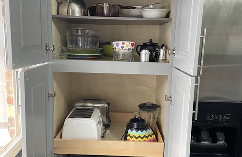 -Fully stocked kitchen with new cabinets, sink, faucet, oven/electric stove, refrigerator with ice and water, dishwasher and microwave. Pantry with staples, tea pot, coffee maker, toasters, baking sheets, pots & pans, dishes, utensils and more!