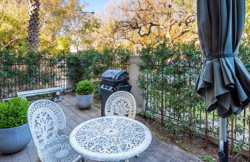 The outdoor garden area is ideal for alfresco dining or relaxing after a day of shopping nearby in the boutique stores.