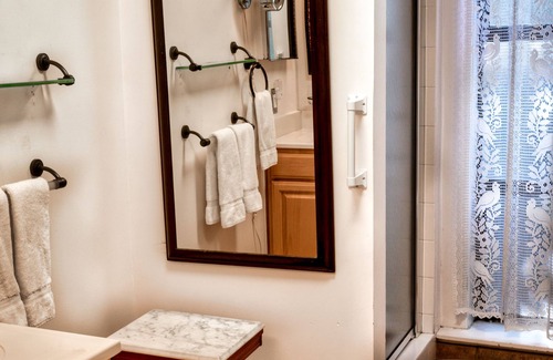 The bathroom shower features a Speakman shower head. There are plenty of thick white towels.