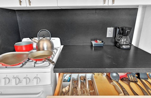 There is a separate fully fitted kitchenette with a stove, refrigerator and freezer, toaster, microwave, drip coffee maker teakettle and more. Full sets of cutlery and crockery are provided along with pots and pans and other utensils so you can make a meal right at home.