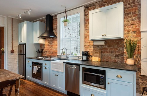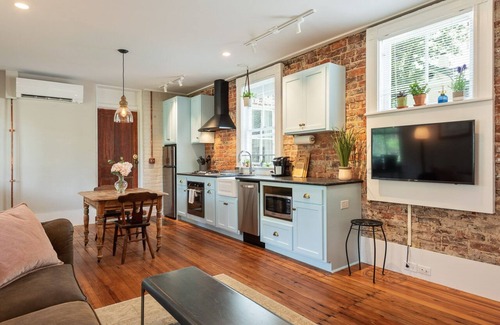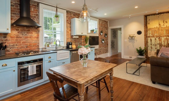 Inspired by a secret garden, the suite combines industrial accents with cozy farmhouse touches. Exposed brick, rustic plaster, and wooden rafters add character, while plush furnishings, a well-stocked kitchen, and carefully layered lighting provide all the comforts of home. Unwind on your private porch with a bistro set or enjoy the shared yard space for yoga, picnics, or quiet reflection.