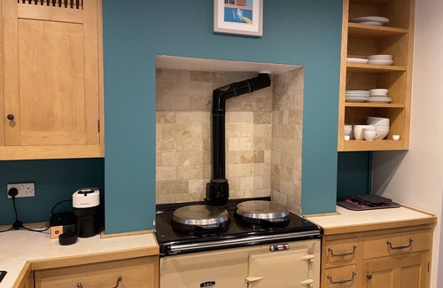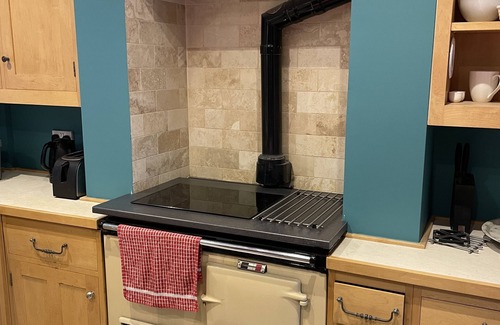 Patio doors open from the bedroom to the walled courtyard garden where you will find a wooden table and 4 chairs. In the summer months, the AGA cooker and oven is turner off as its make the apartment too warm. So there is an induction hob and a counter top single oven. The AGA is on in the autumn and winter months.