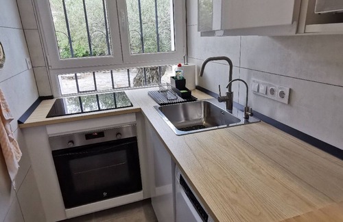 This apartment features a bright living room with large windows overlooking the garden and access to a large 25 m² covered porch, furnished and with direct access to the garden. The kitchen is well equipped (toaster, blender, coffee maker, Italian coffee maker, juicer). There is a double bedroom with a small private terrace with mountain views, a large built-in wardrobe, and an adjacent external bathroom, so it can accommodate 2 people. It is completely bright and exterior. The bedroom has two joined bed bases and two very comfortable, inseparable mattresses, each 90x190 cm, forming a large double bed.