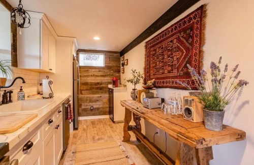 Newly constructed, one-of-a-kind Garden Chalet offers all of the amenities of home in an extremely serene environment. This one bedroom, one bathroom ground floor unit of a two-story duplex features a private entrance, living room and full kitchen. Your stay comes with shared access (owner lives upstairs) to a large, backyard oasis featuring multiple seating areas, firepit and landscaped waterfall.