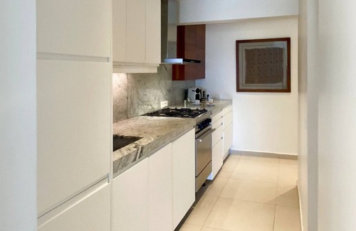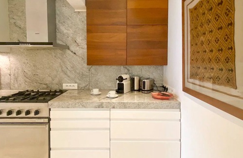 Garden Rock is fully air conditionned, with mosquito nets on every window, and fans if you prefer a seabreeze atmosphere in the apartment. The separate bedroom is ideal for a couple and features a very comfortable queen size bed with mattress topper, featured with high quality Tuscan linens and pillows. The living room sofa can be pulled out into a comfortable queen sized sofa-bed with a thick latex mattress. The terrace has a ceiling fan and is furnished with 2 tables and 8 armchairs, suitable for hosting lunch and dinners.The kitchen is equipped with a refrigerator, freezer, wine refrigerator, dishwasher, traditional Lacanche gas stove oven, microwave oven, Miele washing machine, blender, and Nespresso machine. The television comes with Netflix, Amazon Prime, and the French television service Orange. The bathroom is large, tiled in authentic Mexican tiles, and has a rainfall shower faucet. Garden Rock directly overlooks the shared swimming pool, with a twenty-step staircase leading straight to the water. Garden Rock has one designated parking space, which is space number 38.