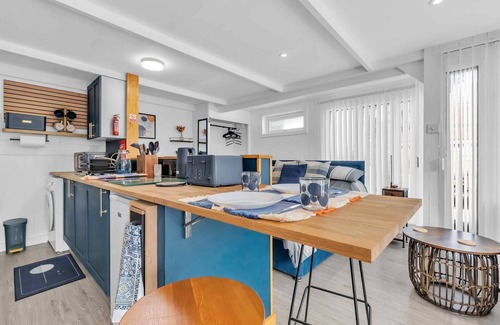 This bright, newly renovated open-plan studio offers a beautifully designed space filled with natural light. The modern kitchen is fully equipped with an induction hob, oven, kettle, washing machine, and all essential cookware, crockery, and glassware—perfect for preparing everything from brunch to a cosy dinner. Complimentary tea, coffee, salt, and pepper are provided to make you feel right at home. The sleeping and living areas blend seamlessly, featuring a comfortable zip and link bed (made up as a double but can be split into two singles on request) and a spacious sofa bed (not yet made up), allowing for flexible use of the space throughout the day. Fresh bed linen is provided for both sleeping arrangements. Whether you're streaming your favourite shows on the Smart TV (just log in with your account) or relaxing with a coffee on the patio, the studio offers a calm and contemporary retreat. Electric heating or a fan is also included to keep you comfortable through the seasons.