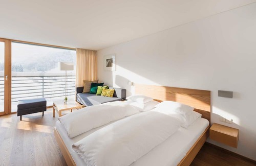 These approximately 35 m² rooms are our most idyllic and quietest rooms. All these rooms have a balcony, bathtub and a separate toilet. The location faces our garden with a natural swimming lake and is therefore very quiet. In addition to a comfortable double bed, the rooms have a seating area and high-quality furniture from Bregenzerwald craftsmen.
