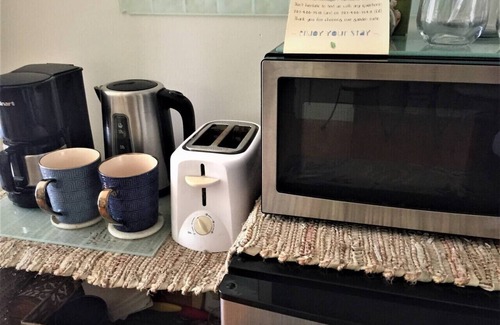 - A convenient kitchenette with essentials for light food preparation, including coffee, tea, condiments, and snacks.