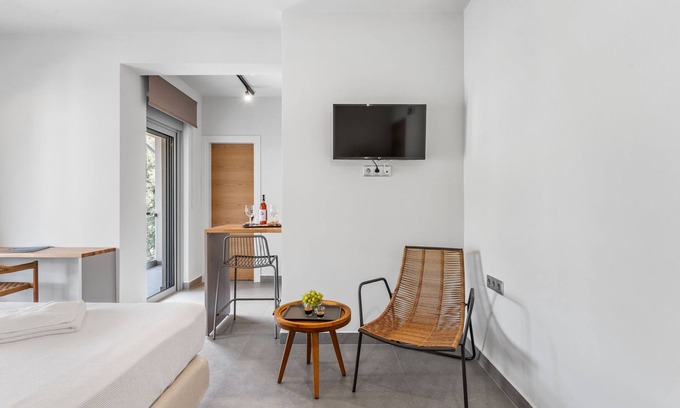Single room layout designed with attention to detail! It is located on the first floor and has a comfortable double bed and a bathroom with shower. It also has an elegant kitchen with two hotplates, sink, fridge and coffee maker! From its private balcony you can enjoy the view of the garden. The welcoming atmosphere and the minimal decoration gives guests a pleasant holiday mood and relaxation!!!