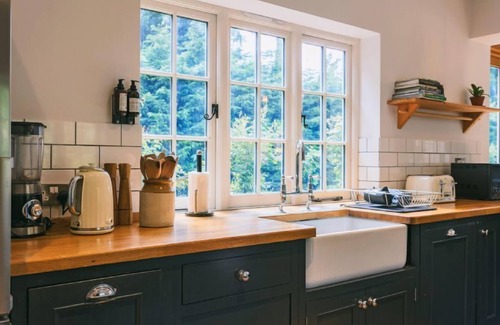 This lovely detached house was completely renovated and restored in 2015 - with an bright and welcoming open plan living and kitchen space which gives direct access to the gardens through the huge bi-fold doors. The top quality bespoke kitchen has everything you need including a marbled-topped central island, five-ring ceramic hob and large American style fridge-freezer. You can dine outside or in with tables which seat up to sixteen, perfect for celebrating special occasions. Comfortable sofas around a large wood burning stove, and wall-mounted television with Sky and DVD player make this room equally cosy in winter. There's also a generous snug room for larger groups to spread out and relax.