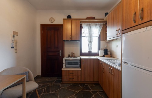 The apartment is tastefully decorated in a traditional Cycladic style, creating a warm