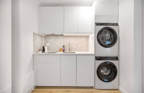 Modern, Compact Kitchen: Includes a fridge, freezer, microwave with grill, two-burner induction cooktop, Nespresso machine, toaster, and cooking essentials like oil. A washing machine and dryer are also provided for your convenience.