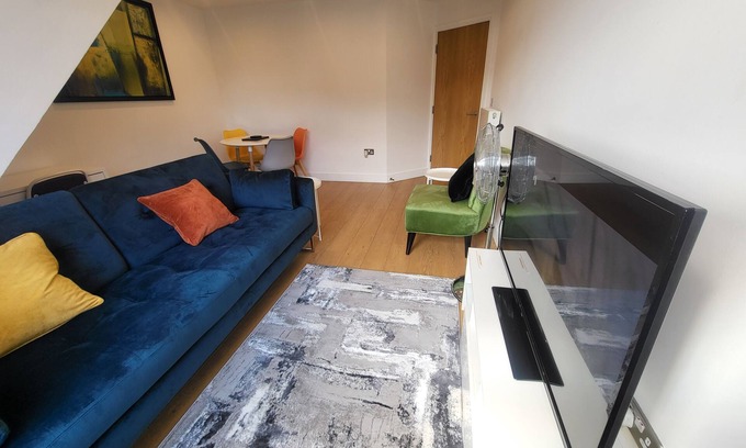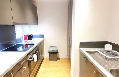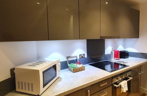 The living room area has a comfy sofa and Armchairs, flat screen TV with Netflix entertainment and smart speakers with Premium Spotify. The Kitchen is fully furnished with integrated Appliances such as Fridge Freezer, Dishwasher, Cooker etc. It also has pots, pans, dishes, mugs, glasses and cutlery for guest's living convenience. Complimentary tea, Coffee & toiletries is also supplied. Apartment has a 3 piece suite Bathroom with integrated shower over the Bath suite and the Bedrooms are furnished with 4 comfortable Single Zip & link beds which can made into Super King beds. This 2nd floor Apartment is 5 minutes walk to the Train station, Gym, Stores, Restaurants and Cafes such as Nandos, Costa, KFC, Mcdonalds, Next, Sainsburys, Aldi etc.
