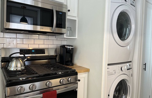 Garrett's Loft has a roomy kitchen with a full-sized oven and stove, microwave, refrigerator, dishwasher, large sink, and ample counter space. We’ve also completely stocked the kitchen with all your cooking essentials for making full meals. Some of the things we provide are: Toaster, blender, pots and pans, baking dishes, wine and drinking glasses, plus plenty of plate ware.