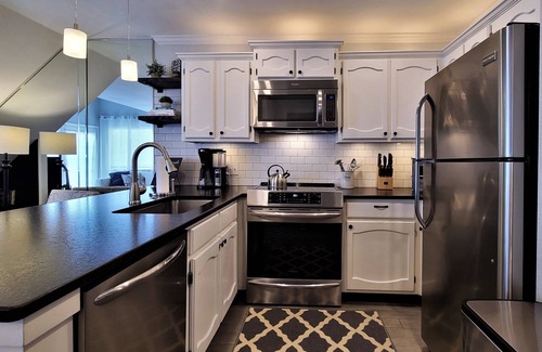 Fully stock kitchen features leathered granite kitchen countertops, induction range with convection oven, stainless steel appliances, coffee maker, convection toaster oven, pantry, & dining area.