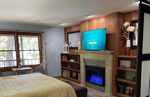 The Sugarbush Lodge is a single-story ground floor 1 bedroom unit. Sugarbush Lodge has a large main bedroom, a living room with access to an outside deck, a kitchenette, and a full bathroom. Sugarbush Lodge can sleep up to 4 people comfortably. The living room includes a queen sofa sleeper, a ROKU TV, a remote-controlled ductless HVAC unit, a dresser and a closet. The main bedroom has a king bed topped with memory-foam mattress, an electric fireplace, a large Roku TV, and a well-appointed desk / table with 2 padded chairs overlooking the park-like garden. The fun kitchenette includes a mini-refrigerator, microwave, Keurig, and toaster. The new bathroom includes a shower, fresh towels, toilet, and sink.