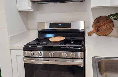 The kitchen is fully equipped with all the necessary appliances and utensils, allowing guests to prepare meals in the comfort of their own space. A dishwasher, Samsung gas stove, and Samsung stainless steel oven make cleaning up a breeze. A French press coffee maker and wine glasses are also available for guests to enjoy.