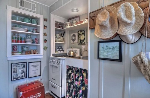 The home, which was featured in Coastal Living Magazine,”Going to Hawaii without the plane ride” is perfect for entertaining because it has three separate living areas. The first area is the main house, situated off a lushly-landscaped courtyard with potted plants and an historic Malibu-tile fountain. It features beamed ceilings, wide-plank Douglas Fir hardwood floors, and two working fireplaces. A spacious great room, fully-stocked kitchen, dining alcove, lanai, and powder room are located at the entrance level of the house. Walk down one flight, and you’ll find a master suite that has a seating area and an en-suite bathroom with a soaking tub. This level also has a guest bedroom with a queen bed and en-suite bath. Both bedrooms have beautiful ocean views.