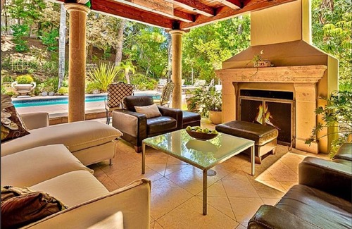 This house' offers the finest in quality and design. Grand two story entry leads to step down living room with vaulted ceilings and fireplace, large media room with fireplace. Formal dining room boasts coffered ceiling, and fireplace. The state of the art kitchen offers top of the line appliances,granite countertops and large eat-in area. Two family bedroom suites plus romantic master with fireplace,vaulted ceiling and wonderful morning sun room. All rooms lead out to beautiful gardens, fountains and a private heated pool, spa and outside sauna. The outdoor living room w/fireplace is perfect for special dining.This property backs the Santa Monica Conservancy which offers hiking trails and nature walks. All the comforts of home to include WII, X box, books and toys! Vacation or live like a celebrity in the celebrity community! Stays more then 21 days pay the utilities (gas, water and electricity)