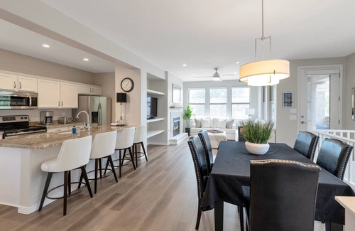 Enter the condo on ground level and walk up a flight of stairs to find a beautiful open floor plan. The kitchen has everything you need to prepare your meals including a dining area seating for 6 plus 4 barstools at the kitchen counter and another table seating for 4 in the kitchen, microwave, stove/oven, fridge, cookware, utensils, and a traditional coffee maker. The living room is just off the kitchen and dining room and features a sofa, loveseat, 46” Smart TV with Cable, gas fireplace and on those cooler evenings and mornings relax and enjoy the covered balcony with outdoor seating just off the living room.