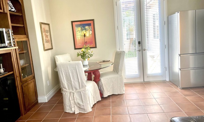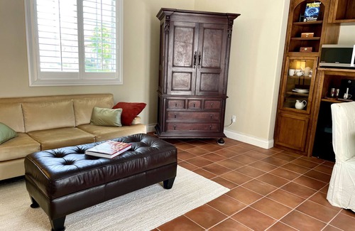 This private lock-out guest suite has 1-bedroom plus living room and private bathroom. It has its own entrance and alarm. Enjoy the the light-filled living room with pleasant views in front and back. The large bedroom has a king-sized bed, ample closet, and light-blocking shutters.