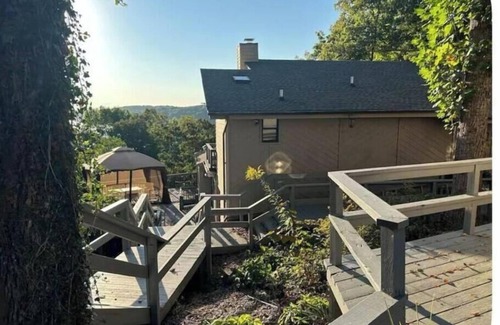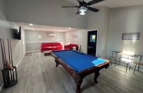 This welcoming house in Bronston is the perfect home base for your trip. WIFI. Three levels, with 6 bedrooms. Building with Game room with TV, Pool Table and Refrigerator. Red Queen Sofa Bed, also bedroom with 3 bunk beds and Shower bathroom. First level, main house, Master Suite with full bathroom, King sized bed, walk out deck with views of Lake Cumberland and walk in closet), Red Sofa is a twin bed. Main level of home also contains, well equipped Kitchen, 1 full bathroom with both shower bathtub, 1 Bedroom with Queen Bed, and 1 bedroom with 3 bunk beds. Living room with Sofa that can be put together for a bed. Full Laundry room. Walk out to Gazebo , Fire pit & grill, view of Lake. Garden Level , with driveway to two Bedrooms with Jack and jill bathroom, coffee bar and refrigerator. Garden with gate, for the outdoor person can walk to shore of Cumberland. The beautiful surroundings and thoughtful amenities like heating and AC make this property a delightful choice for your vacation. Book now and enjoy everything this house has to offer.