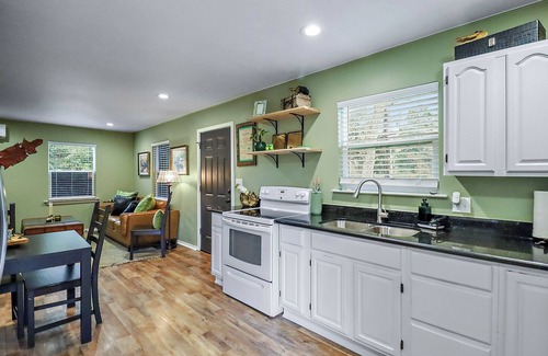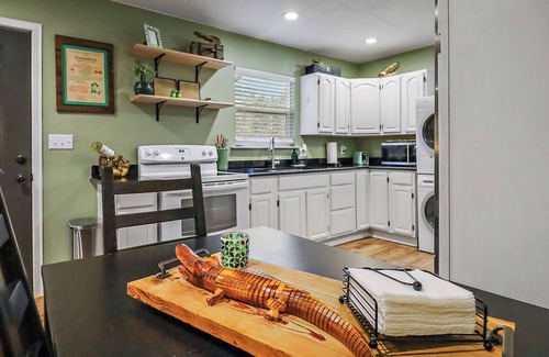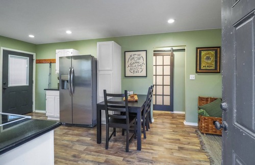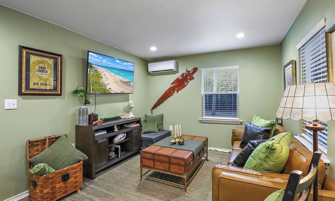 Immerse yourself in the local culture of Anahuac, the Alligator Capital of Texas. This cottage offers 2 bedrooms with queen beds, a bathroom with a shower, and a cozy living room open with the kitchen and dining. Guests can enjoy amenities like a washing machine and dryer, WiFi, AC, and heating during their stay. Can't wait to "See Ya Later, Alligator!"