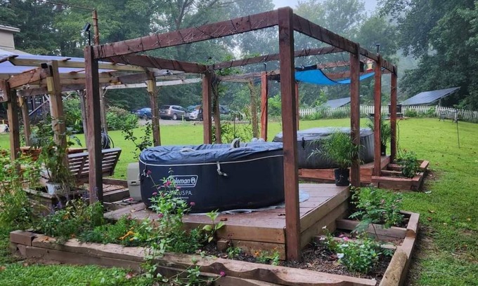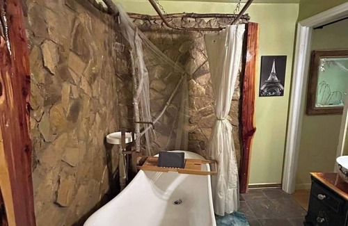 A 1920s themed Gatsby style romantic getaway on the river in beautiful Benton Tennessee. Private room with full bath. Access to half kitchen. Free breakfast on site. Guest will have access to outdoor hot tubs, fire pit and the river. There is an onsite host for any and all needs that you may have while enjoying your stay. Enjoy the Hiwassee River, beautiful hiking trails and tubing just minutes away from our location.