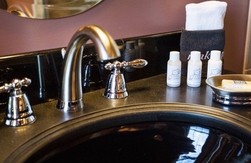 In the chic manner of Art Nouveau, this queen-sized room steps back in time to generate a sense of artful style and elegance. A unique mahogany “wrap” bed is donned in velvet and brocade to match the window treatments. A black granite vanity and huge double shower set off the stunning windowed bath.