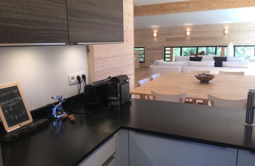 1. garage with boot dryer and dry glove, 4 other outdoor parking spaces; shower drainer cloakroom; wc; Entrance ; living room with sofa stove; dining tables from 8 to 18 p. ; kitchen with two ovens (traditional, steam, microwave, freezer large capacity, household robots, coffee machine, plancha raclette fondue services ....; balcony