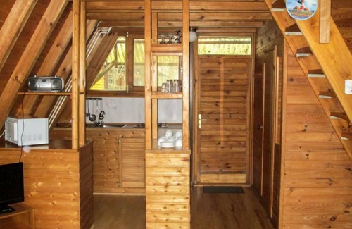 3-room house 50 m2 on 2 levels, on the ground floor. Simple furnishings: living/dining room with sloping ceilings with satellite TV and radio. Small kitchenette (3 hot plates, electric coffee machine). Shower/WC. Upper floor: (steep stair), 2 rooms with sloping ceilings, each room with 2 beds. Gas heating. Terrace roofed. Terrace furniture. Facilities: children's high chair (extra). Internet (WiFi, free). Parking at the house. Please note: non-smoking house. Maximum 2 pets/ dogs allowed. Smoke alarm. House constructed in timber, access to the top floor via a narrow staircase.
