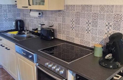 Komplett ausgestattete Küche mit Spülmaschine, Mikrowelle, Kaffeemaschine (Padmaschine), Milchaufschäumer, Wasserkocher, Toaster, Backofen, Vier-Platten-Kochceranfeld und Kühlschrank mit Gefrierfach. Kaffeepads, Tee, Zucker, Pfeffer, Salz und Öl sind für die ersten Tage vorhanden.