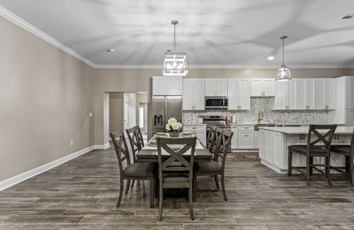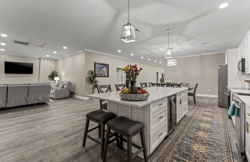 This newly remodeled interior home has spacious 10' ceilings and elegant finishes. Each room includes high end mattresses, spacious closets, drawers, ceiling fan and their own 50" Samsung television. The living room is filled with cozy recliners for you to enjoy. The kitchen has a big quartz island for everyone to gather around and a big counter space for you to place your items while your cook. The master room has its own full bathroom w/ tub and the other 4 bedrooms share two full bathrooms, one with tub and the other with a shower. Lastly, the home has a large washer and dryer for the family to quickly get clean clothe.
