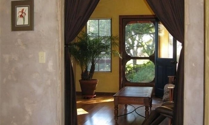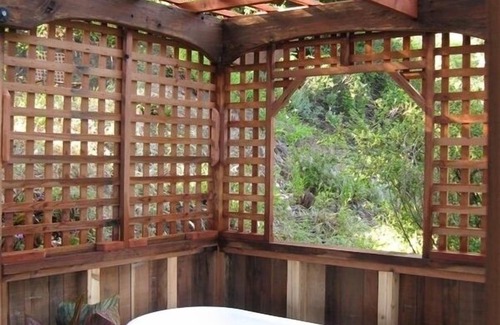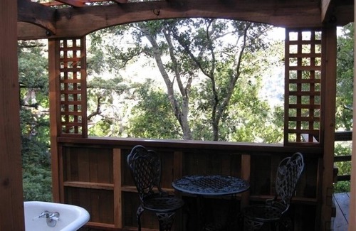 This is a secluded gem of a cabin with craftsman touches in a very lovely setting. It sits in a private corner of the property with magical filtered light through the oak and redwood forest. South facing with a beautiful mountain/canyon view it is very spacious (aprox 600sf) with the tinted plaster walls and arches giving it a very warm, old world feel. The quaint little bedroom is accessed by an outdoor covered staircase and has a spectacular view of the canyon. There is very nice deck space on three sides of the cabin, where one can sit in sun or shade while enjoying the abundant bird life and forest/mountain/canyon views. Or relax in our deep clawfoot tub that sits in our redwood gardenroom. Deer and quail are commonly seen, with the occasional glimpse of a bobcat or fox. And no need to bring your own water, we've plenty of good well water here.
